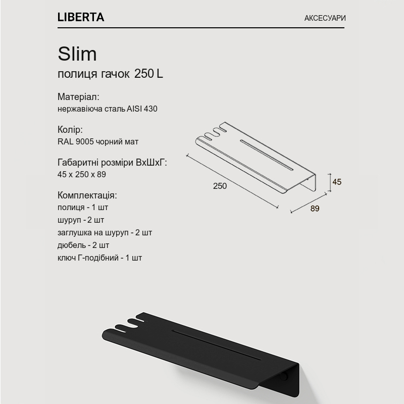 Довжина, см25Комплектаціяполиця. кріпленняМатеріалНержавіюча сталь AISI 304Тип монтажунастіннийКраїна виробникУкраїнаСеріяSlimКолірчорнийВидполиця