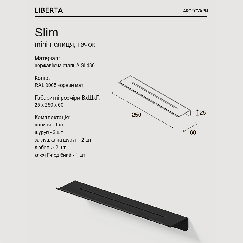 Довжина, см25Комплектаціяполиця. кріпленняМатеріалНержавіюча сталь AISI 304Тип монтажунастіннийКраїна виробникУкраїнаСеріяSlimКолірбілийВидполиця