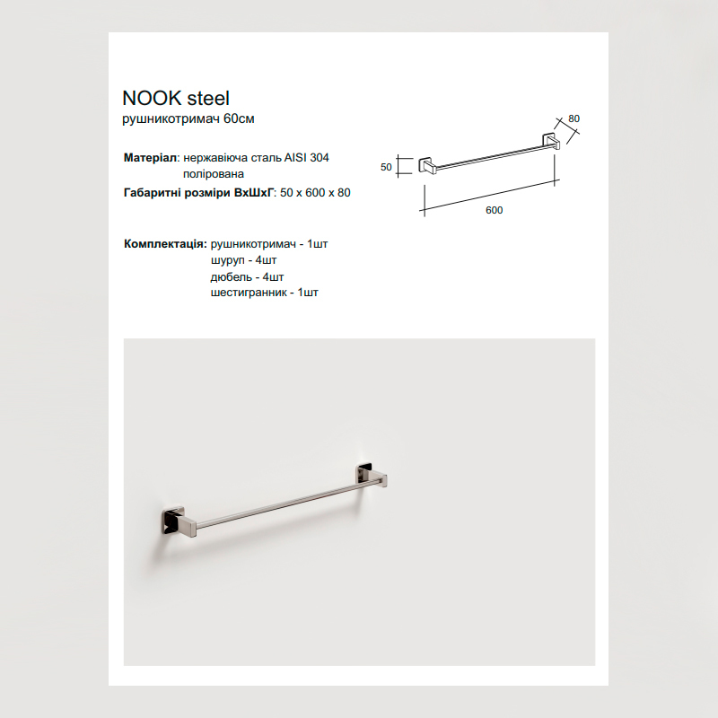 Довжина, см60Комплектаціярушникотримач. кріпленняМатеріалНержавіюча сталь AISI 304Тип монтажунастіннийКраїна виробникУкраїнаСеріяNookКолірхромВидрушникотримач
