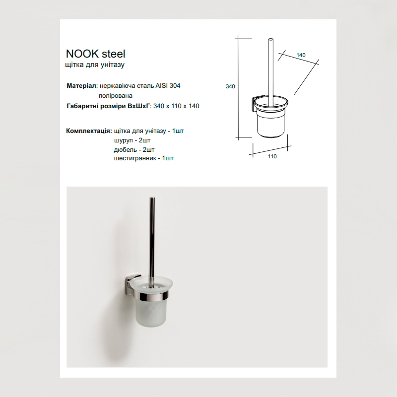Довжина, см11Комплектаціящітка для унітазу. кріпленняМатеріалНержавіюча сталь AISI 304Тип монтажунастіннийКраїна виробникУкраїнаСеріяNookКолірбілийВидщітка для унітазу